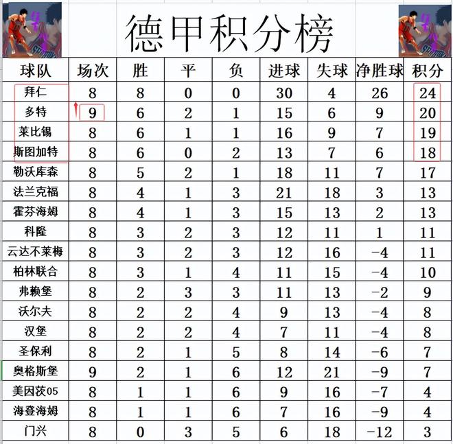 积分榜方面,拜仁继续保持全胜,8连胜的他们高居榜首,多特今天先赛赢球后,暂时超过斯图加特和莱比锡升至第2,落后拜仁4分。输球的奥格斯堡仍在降级区边缘徘徊,只比美因茨多3分排在倒数第4。