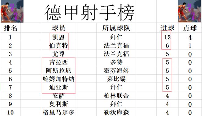 射手榜方面,凯恩同样是高歌猛进,大有早早终结悬念之意,12球高居榜首,比第2的伯克特足足多了一倍。吉拉西今天打入制胜球后追上尤尊,阿斯拉尼,鲍姆加特纳和迪亚斯,几人5球并列第3,落后凯恩7球。